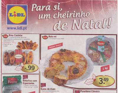 Outro sinal é o dos “Supermercados Lidl” e hoje já estava na caixa do correio a “Dica da Semana” a informar que a partir de hoje já por lá há um “cheirinho de Natal” com Bolo-Rei a 3,49 euros e Broas Castelar a 99 cêntimos.