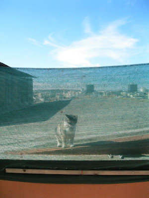 O gato passeava aqui, ali